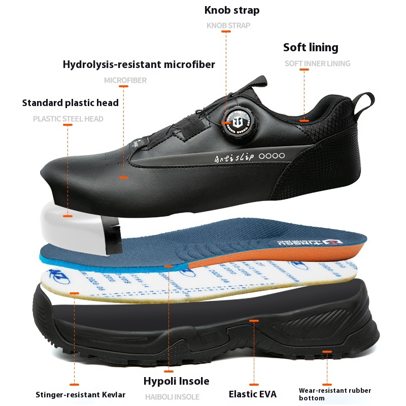The upper is made of high-quality microfiber leather, a high-tech bionic material that boasts lightweight properties, excellent breathability, and stable performance – weighing only 1/3 of natural cowhide, it reduces foot load during long shifts while offering superior water resistance to keep feet dry in damp environments. The lining adopts breathable mesh material, which enhances air circulation, wicks away moisture, and prevents odor buildup, ensuring comfort even during prolonged wear. For core safety protection, the shoe features a plastic toe cap that meets strict safety standards, effectively resisting impact and compression to protect toes from falling objects; the midsole is made of Kevlar material, with puncture resistance exceeding 1100N, firmly blocking sharp objects such as nails and metal shards from penetrating the sole. Additionally, the TG604 is equipped with electrical insulation performance, making it suitable for electrical work scenarios, while the MD outsole – a combination of lightweight EVA and durable rubber – features a non-slip tread pattern that enhances grip on various surfaces, further reducing slip risks in complex workplaces. Consistent with the factory’s commitment to quality, the TG604 maintains a product qualification rate of over 98% through strict quality control procedures.